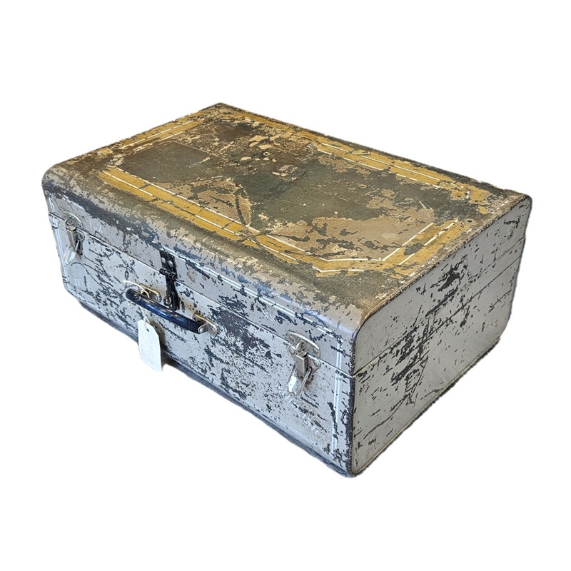Metalen vintage koffer met roest en gebruikssporen voor decoratie of het opbergen van je spullen. Deze stalen vintage koffer is af te sluiten d.m.v. een slotje. Doordat dit géén productie koffers zijn maar echt authentiek vintage metalen koffers is er steeds wisselende voorraad in afmetingen en kleuren.